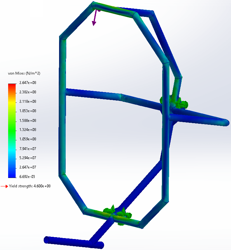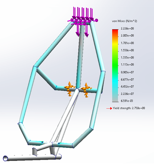 In the caption of the simulated vertical force test, I noted that there was a simulation error in the static simulation. The maximum stress displayed by the legend is 2.23*108 N/m2, much larger than the 1.34*108 N/m2. However, the the error can be found by examining the simulation’s symmetry. The applied nearly vertical force has no horizontal component and the frame was designed to be symmetrical. Therefore, the stress distribution should be symmetrical. The peak stress was measured at the right side triple junction of the rollover protection bar and its support. Since nothing close to the peak stress was measured on the equivalent part of the left side, I concluded that the peak stress was fictional.