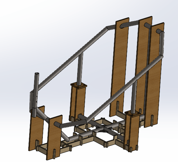 I spearheaded the team’s manufacturing push. I conceptualized a welding jig for the rear frame and made a CAD of the jig with a team member, Sunny Lin. Then, I laser cut the pieces of the welding jig and pushed on to weld the frame together. The welding jig was designed to hold metal tubing in place when I welded the frame together. To reduce the amount of material needed for the welding jig, I decided to weld some sections of the frame on a flat surface before placing them into the jig. Thus, the welding jig only needed to hold sections of the frame in place rather than every single tube. With this in mind, I designed the welding jig. This jig was made from 3/8ths inch thick plywood capable of holding the frame together in one piece. The jig held the frame ninety degrees from its final orientation, which made it easier to weld the frame together. Specifically, the supports of the roll cage were held vertically, making it easier to place the roll cage onto the frame. Overall, this welding jig was successful, allowing me to weld most of the rear frame together, though metal warping kept me from finishing the job.