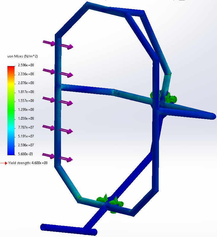 Over the course of the next few months, I worked with my team to design a frame and other parts of the vehicle until it was ready for fabrication. This frame was to be made from 6061 T6 aluminum tubing welded together because aluminum has a good strength to weight ratio. The primary design constraint I designed the frame around was the need for a rollover protection system that protects the rider from any impact. Essentially, a roll cage. The roll cage needed to survive a side load of 1330 Newtons and a top load of 2670 Newtons 12 degrees off vertical. These forces needed to travel through the frame to harness attachment points, indicating that the harness holding the rider in place can survive a roll. The frame was designed quickly to withstand both the side and top loads with a safety factor above 2.