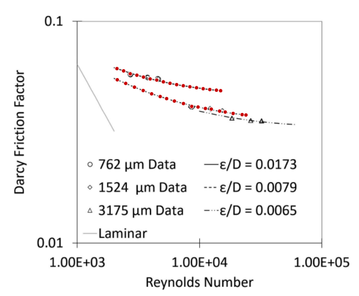 From this, I calculated the diameter of the oxygen hole. I used the Darcy-Weisbach equation to find a pressure loss which will produce my calculated mass flow rate. This calculated pressure loss was 244679 pascals. I then used this pressure loss and the mass flow rate of oxygen to find the diameter of the diameter of the oxygen hole. This diameter was 0.715 mm. To make the Darcy-Weisbach equation suitable for my calculations, I substituted terms until the only remaining variables were the mass flow rate, the diameter of the tube and the pressure loss. Every other term was a predefined constant. The Darcy Friction Factor was approximated using data from Understanding Flow Characteristics in Metal Additive Manufacturing.[13] One of the trend lines was for a tube with a diameter of 0.762 mm, which is close to the size of tube I desired. Since there was no equation for tubes with smaller diameters to make a weighted average with, I only used the 0.762 mm equation. Through substitution, I converted the Reynolds Number into a series of constants alongside the mass flow rate and the diameter of the tube. As a result, I had the Darcy Friction Factor and the rest of the Darcy-Weisbach equation in the previously stated terms.