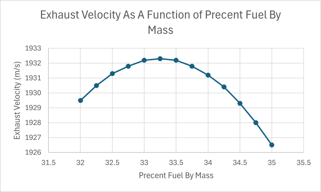 I found that the exhaust velocity, measured in meters per second, peaks when the Pliny uses 33.25% fuel by weight. This combustion is fuel rich and results in an exhaust composed of 50.3% by weight carbon monoxide, 21.1% carbon dioxide, 25.8% water and 1.6% percent by mass hydrogen. The leftover components combined amount to approximately a percent of the exhaust. The reason why the exhaust velocity peaks at 33.25% fuel is because carbon monoxide is less massive than carbon dioxide. Since lighter molecules move faster for a given temperature, it can compensate for how the falling combustion temperature reduces the amount of heat energy available.